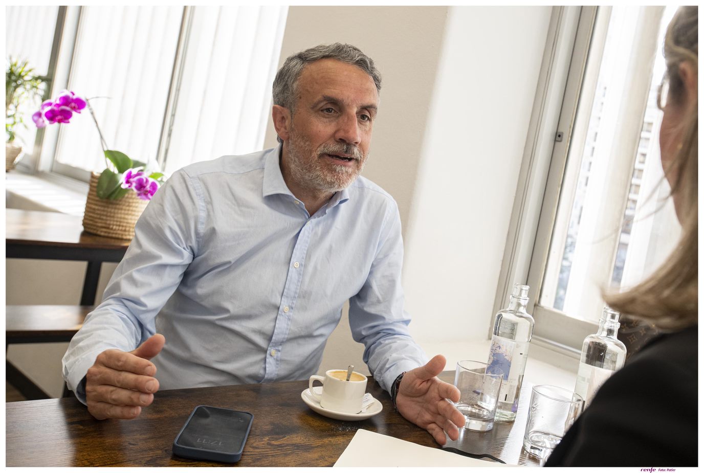 Carlos llega a la cita vestido con americana oscura, camisa azul y pantalones de apariencia clásica, aunque informal. Surge durante la conversación que, entre los muchos pares de calcetines del cajón, hoy ha elegido los del color corporativo de Renfe. Muestra con este gesto mucho de lo que cuenta en las respuestas de la entrevista, que se han de hacer guiños al público objetivo, empatizar para humanizarnos y sin necesidad de que complejos algoritmos nos marquen el paso.