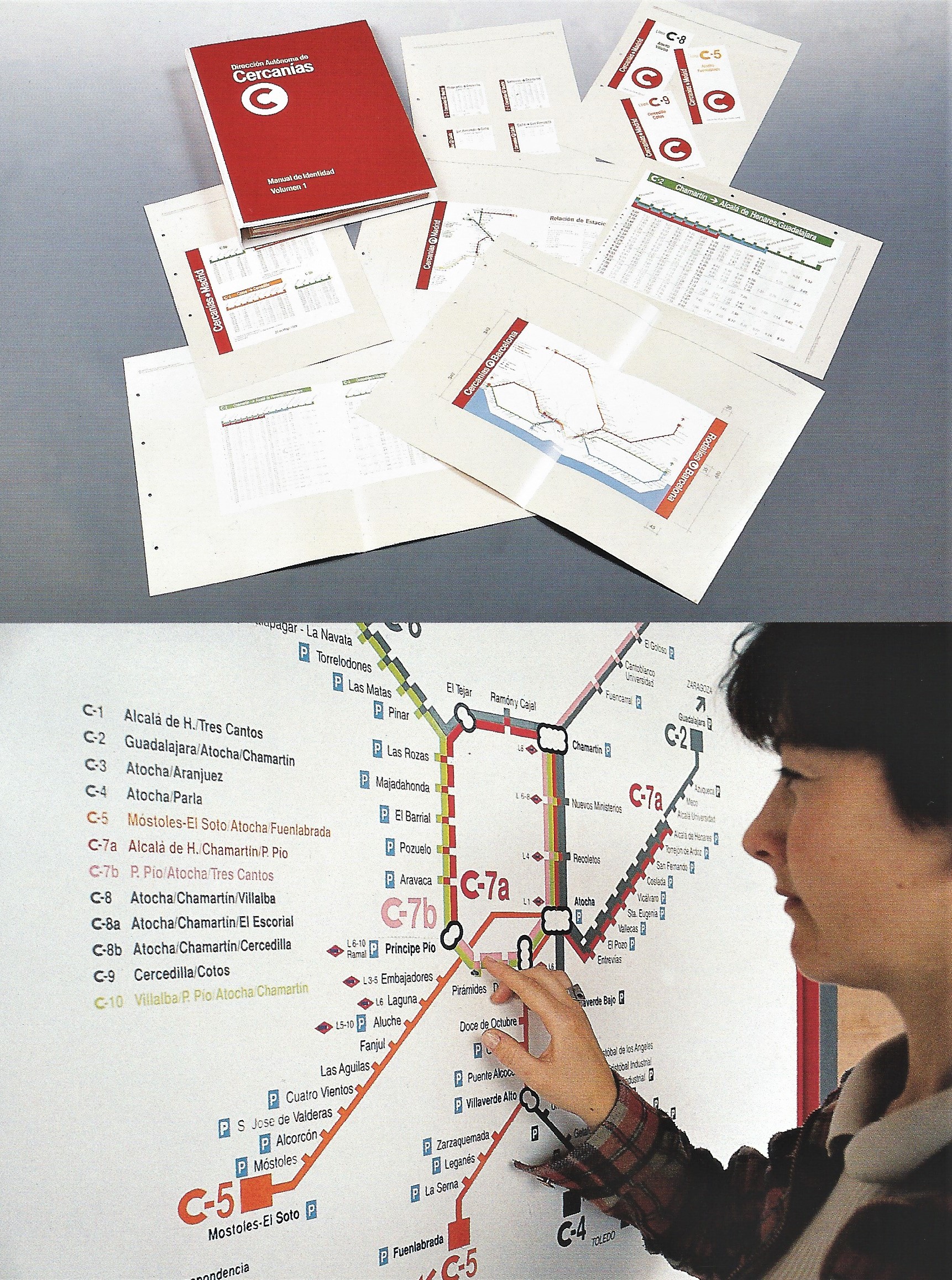 “Todo estaba muy pensado desde el principio: Naming, señalización e identidad, mobiliario, interior de los “coches”, mapas, hilo musical, horarios”. La clave radica en la puntualidad y es la primera vez que un tren pasa a las 13.27 y no el “en torno a”. Alberto Corazón crea esa “C” que se separa de los acrónimos que estaban más asentados. Al comenzar los años 90 se implantó el giro de la “C”. De esta manera el mismo logo podía adaptarse a las palabras que se utilizan en las otras lenguas co-oficiales para nombrar al cercanías, como Rodalies, Rodalia o Aldirikoak.