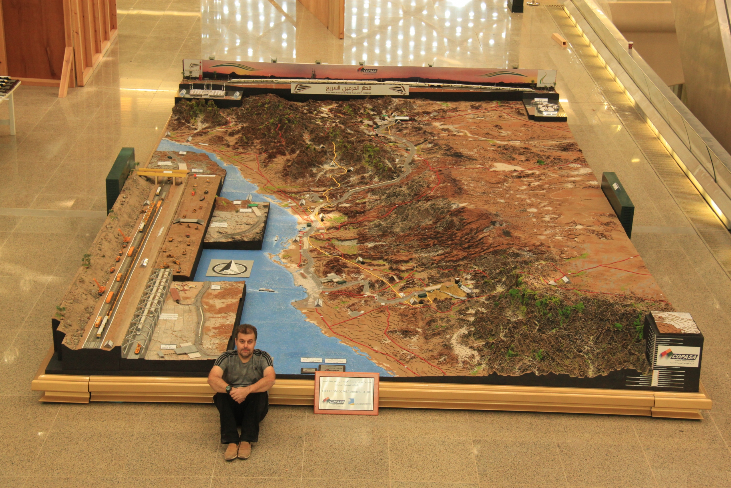 Probablemente sí. Es una maqueta que mide 80 metros cuadrados y además pude hacer lo que quise, no me pusieron trabas a nivel de diseño ni económico. Estuve dos años trabajando para terminar esa maqueta que ahora se exhibe permanentemente en la estación de Kaec. Yo me vine para España unas navidades y tuve que preparar aquí todo porque en materia de modelismo no encuentras nada en Arabia, ni tiendas de maquetas ni nada por el estilo. Tuve que venir a España y preparar dos contenedores de material. Cada vez que iba de viaje, llevaba las maletas llenas de material. Empecé a hacer la maqueta en un sótano en el edificio en el que vivía, y cuando esa maqueta ya estuvo muy avanzada, nos fuimos a la estación de Kaec y trasladamos todo allí para seguir trabajando in situ. Es una estación enorme, como puede ser Atocha, cubierta de mármol, y allí me metieron a mí solo hasta que la terminé. Tenía que hacer 100 kilómetros para llegar cada día, pero fue un privilegio. Es una maqueta muy compleja porque contempla 400 kilómetros de línea, se hicieron secciones constructivas, los trenes Ave, las máquinas de vía, etc. El resultado final creo que es el de una maqueta muy didáctica.