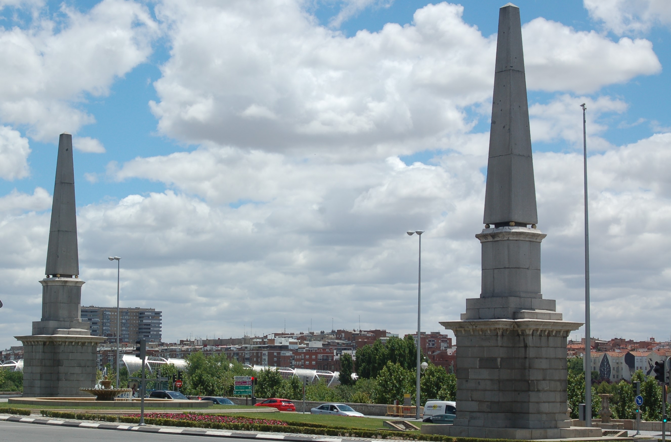 Bien, si bajamos por el Paseo de las Acacias en dirección al Manzanares nos encontramos con la Glorieta de Pirámides. Inicialmente esa glorieta se denominó Glorieta del Puente de Toledo ya que constituye la puerta de acceso al citado puente. Su actual nombre proviene de dos grandes obeliscos construidos por Francisco Javier de Marietegui y erigidos en la plaza en 1831, aunque no fue hasta 1944 cuando la citada glorieta cambió su nombre debido a los monolitos. El motivo de su creación fue el interés de la época por engalanar las ciudades con adornos romanos o egipcios. Estos obeliscos gemelos fueron construidos con una mezcla de granito y caliza y 14 metros de altura. La parte piramidal, que da nombre al monumento, mide unos 7 metros y se asienta en la base sobre cuatro esferas doradas. A mediados de los años 90 fueron restaurados creándose una isleta central ajardinada y se instaló una fuente como acompañamiento de dichos elementos.