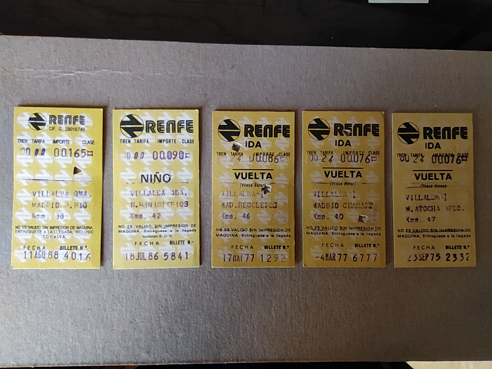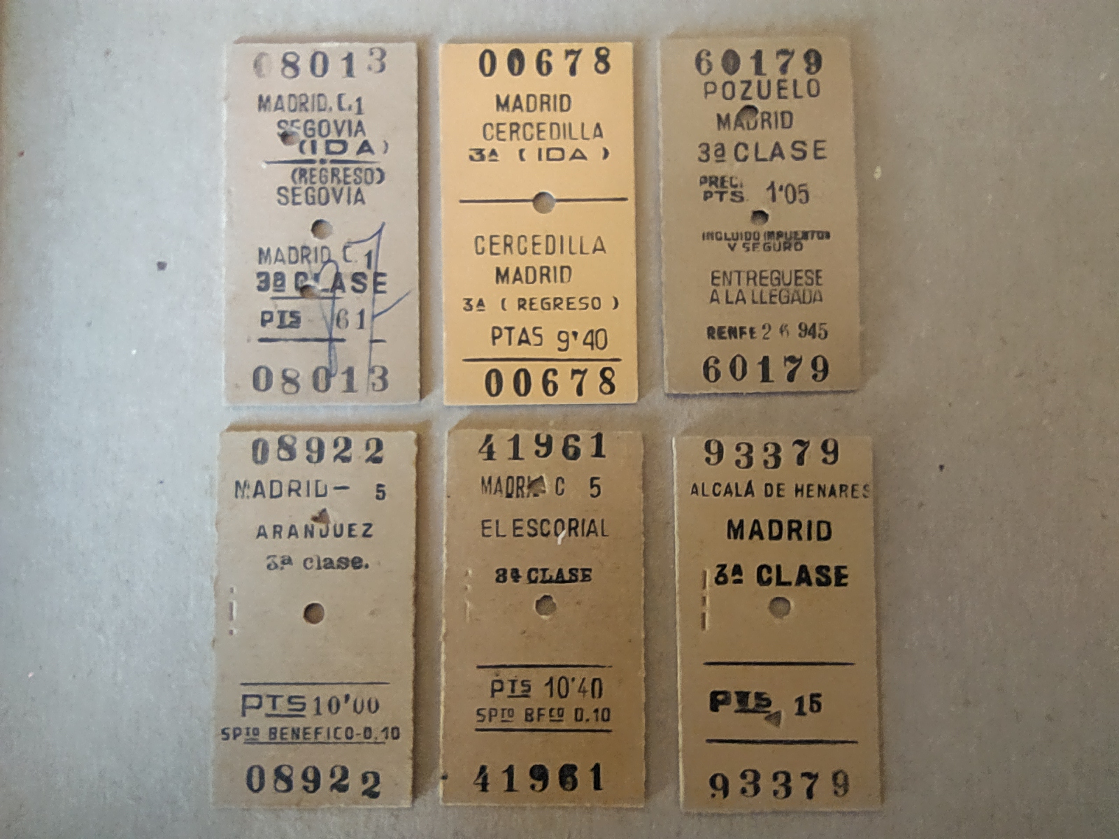 Estos billetes de viajeros eran fundamentalmente de tres colores – amarillo, verde y siena–. Fueron los mismos que heredaron las máquinas Hugin (nombrados posteriormente), además de los billetes especiales, los complementarios o de tarifas especiales que tuvieron multitud de formatos y colores. Sus dimensiones eran de cerca de un milímetro de grosor y de 58 x 31 milímetros de tamaño. Los billetes de Cercanías de Ida y Regreso durante los últimos años de estos billetes de Renfe tenían una doble franja vertical roja impresa en los mismos.