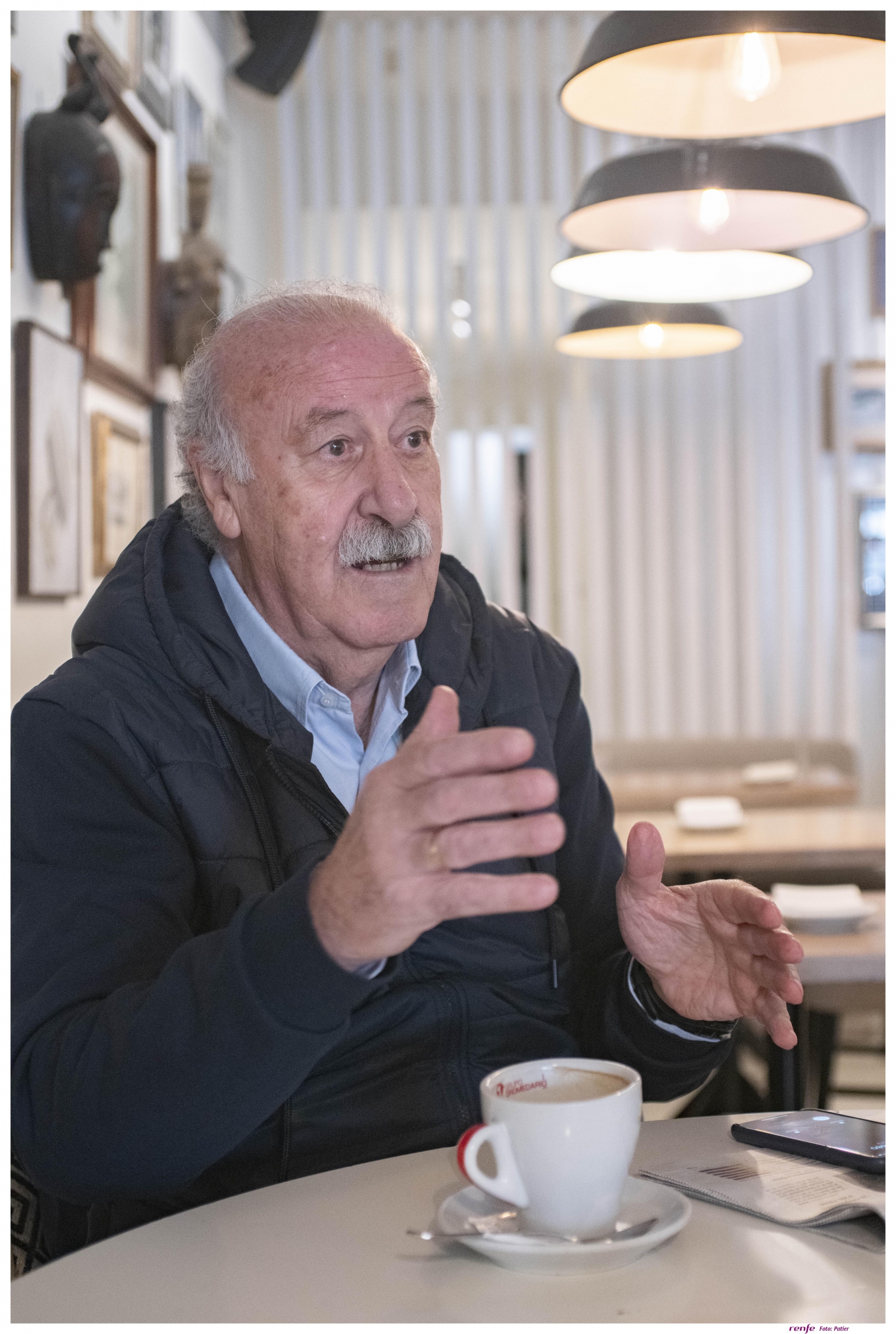 El primer protagonista de Tren en las venas es Vicente del Bosque, nieto, sobrino y yerno de ferroviarios. El motivo de la entrevista tendrá tren de fondo desde la cabecera de la máquina hasta el furgón de cola y, para ello, recorreremos infancia, juventud y vida adulta a bordo del ferrocarril con vistas frontales al recuerdo. El Seleccionador Nacional Campeón del Mundo con España, llega minutos antes, y cuenta al presentarnos, que es una costumbre que arrastra desde siempre; anticiparse para así poder observar el espacio, tomar posiciones y sentirse cómodo en el terreno que pisa. Tiene mucho que ver con su carácter prudente y de emociones contenidas. Tímido en apariencia, cercano en el trato, humilde y estimado por aquellos que le conocen y admirado por quienes le reconocen a paso de hombre. Nos servimos del silbato para pitar la salida y arrancamos con usted a bordo si desea acompañarnos: